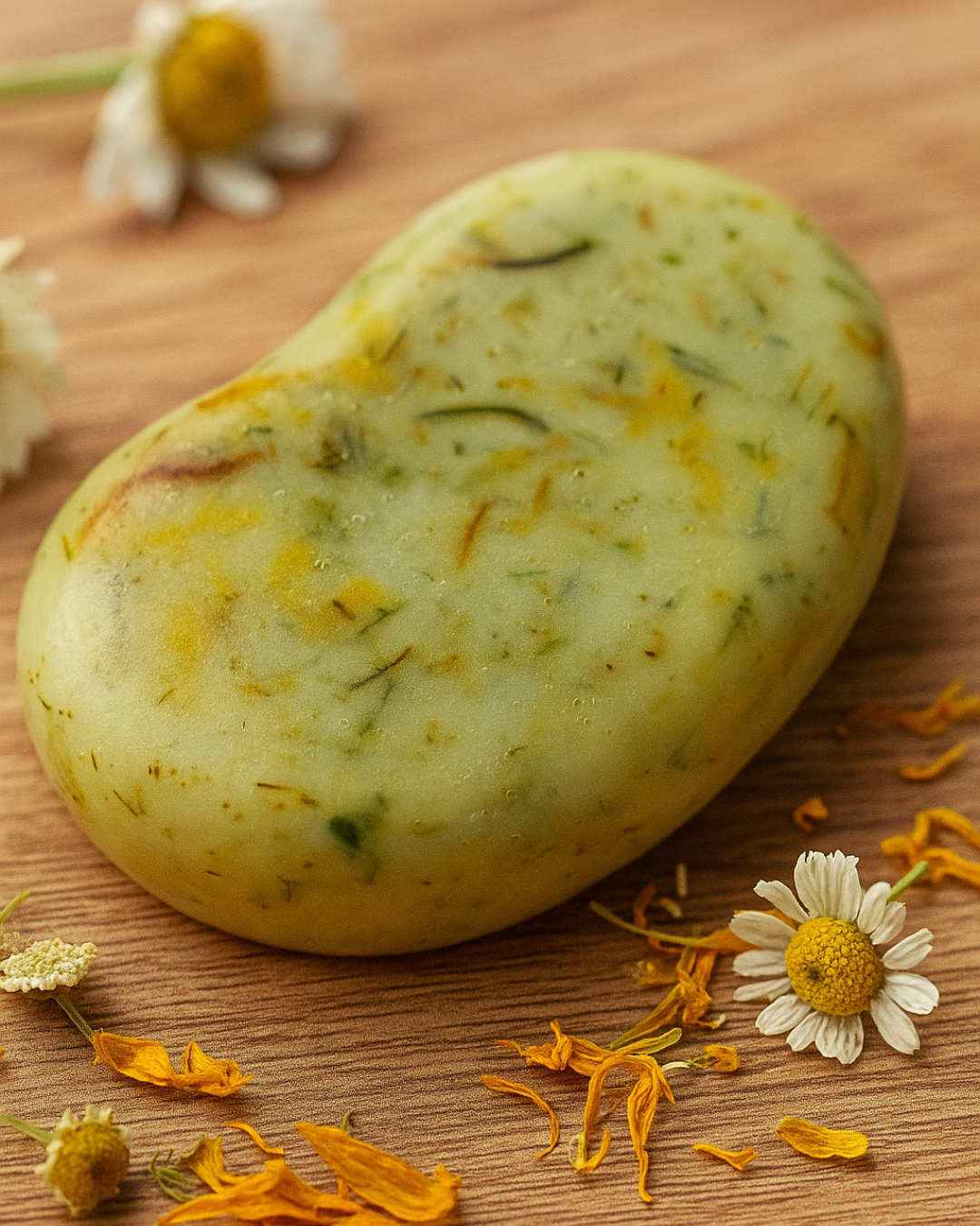 Enriquecido com extrato vegetal de calêndula e camomila, plantas reconhecidas por suas propriedades calmantes, anti-inflamatórias e restauradoras, este sabonete proporciona um toque acolhedor e suavizante.